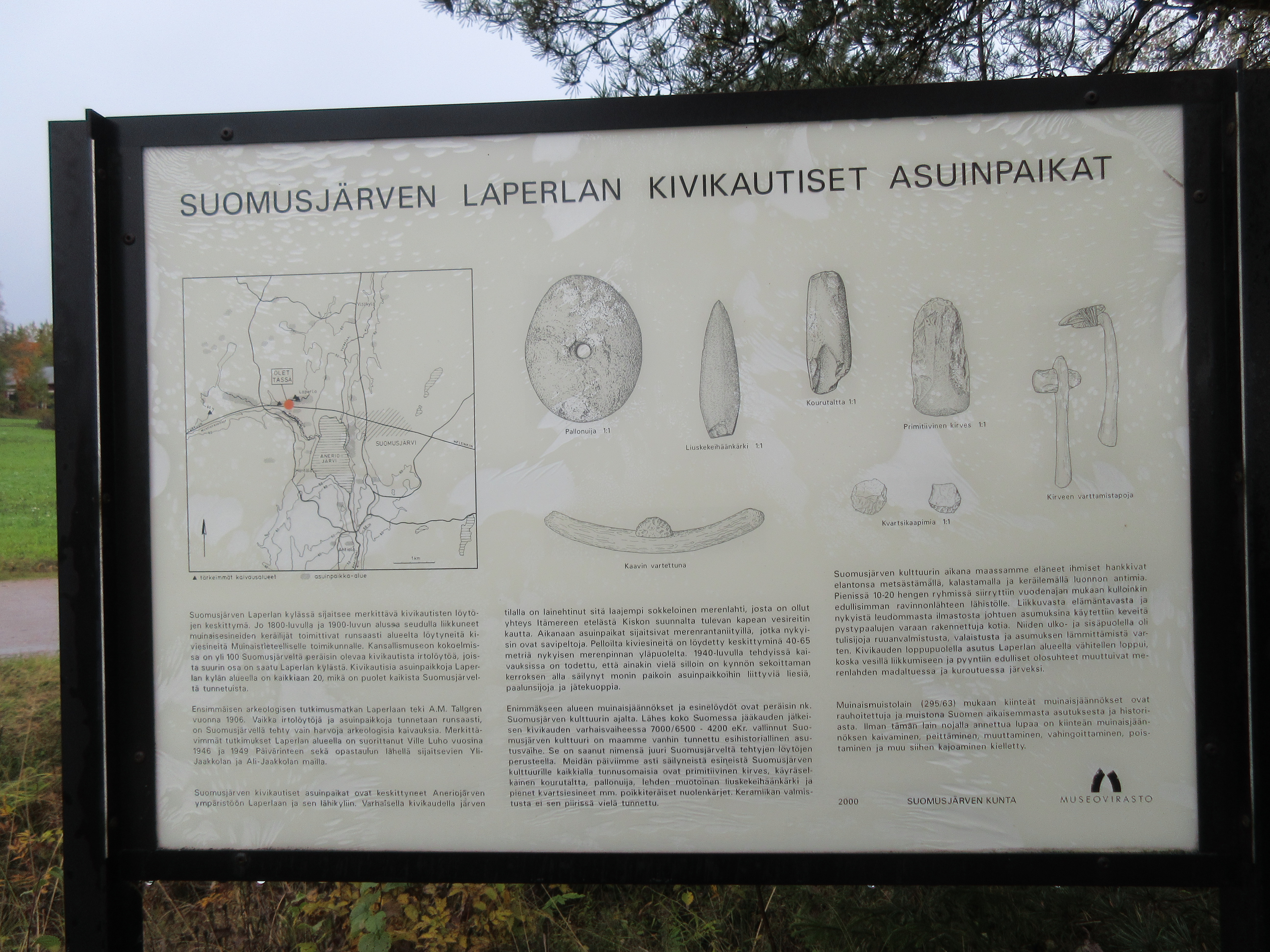 Kulttuuripolun varrella Laperlassa opastaulu kertoo Suomusjärven Laperlan kivikautisista asuinpaikoista.