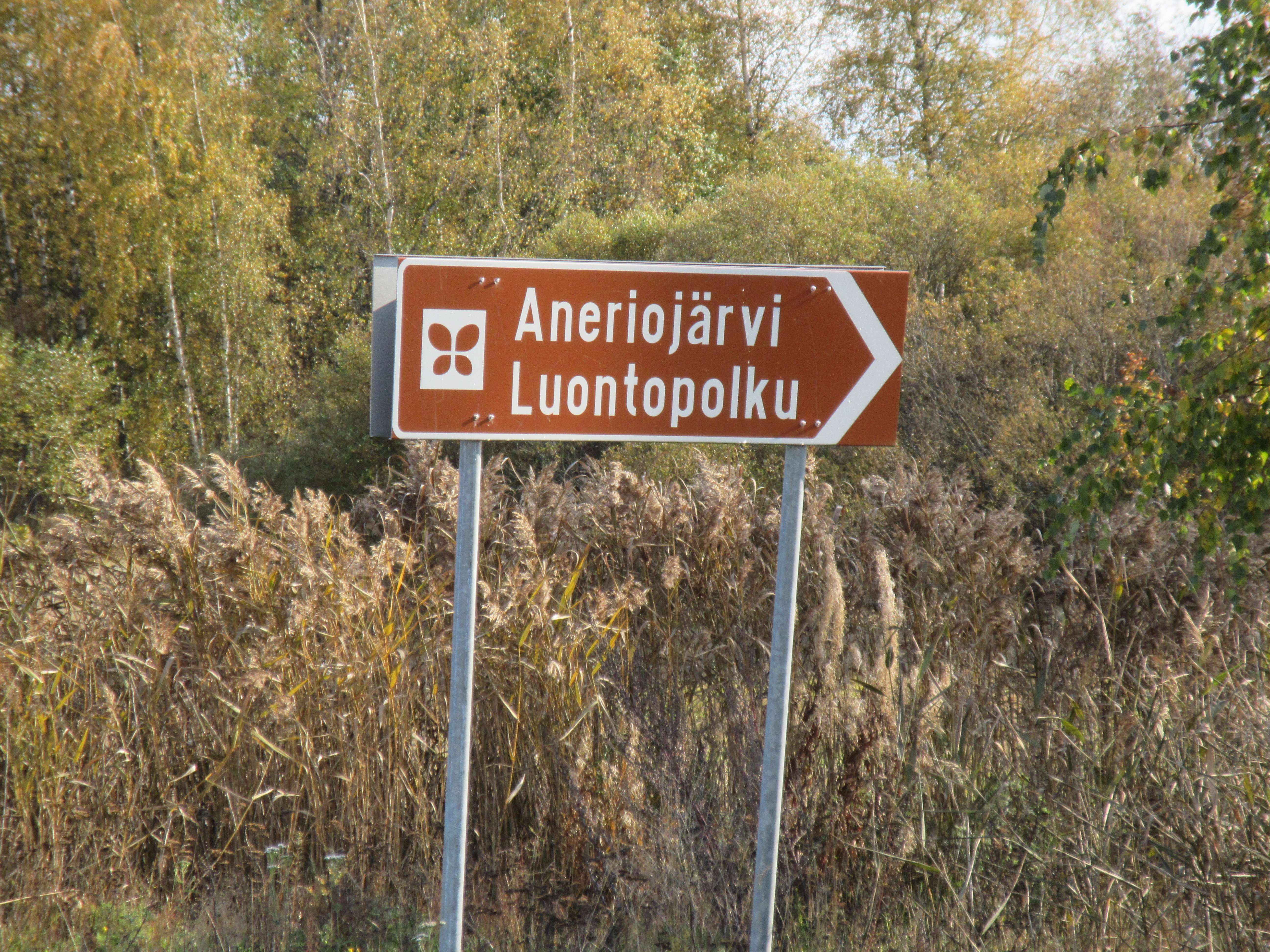 Maantieltä 110 (Helsingintie 2543 (noin)) on ruskea opasviitta ”Aneriojärvi, Luontopolku” P-alueelle.