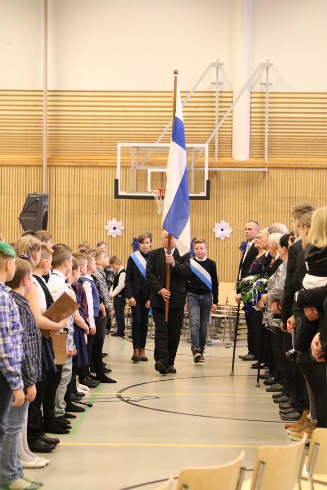 Suomen lippu saapuu Suomusjärven koulun juhlasaliin.