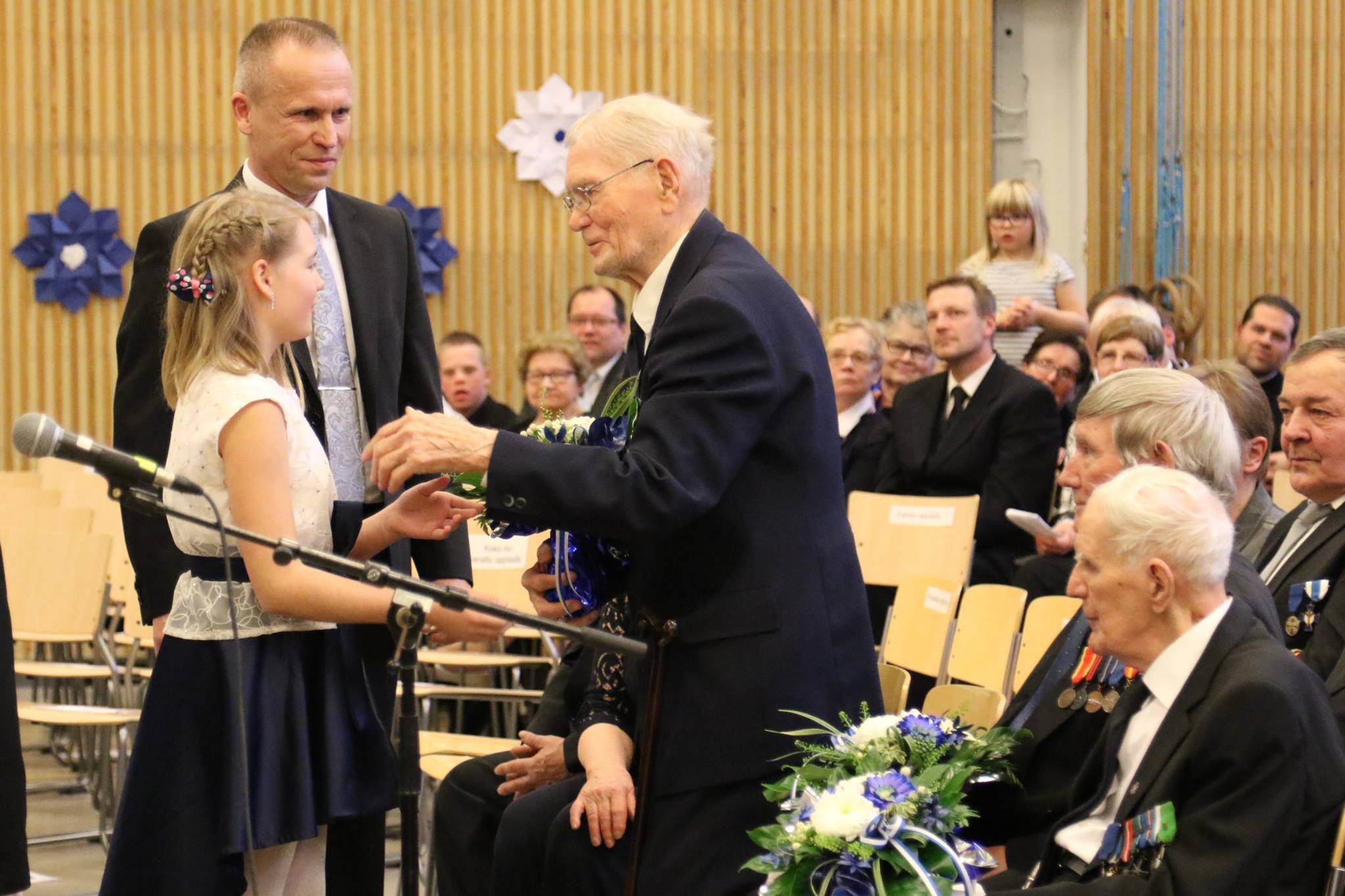 Suomusjärven koulun oppilas ojentaa kukkakimpun sotaveteraanille.